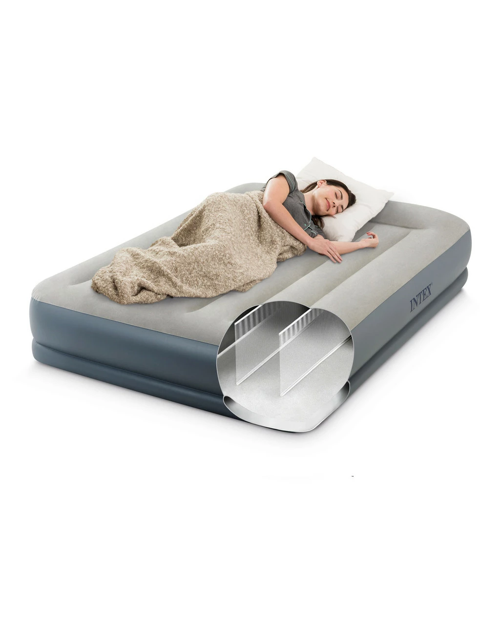 The 12in compact air mattress offers the perfect all-around sleeping solution, providing both campers and in-home users with the convenience of a lightweight and portable bed. Fiber-Tech construction adds lasting support and durability to the bed. The built-in pillow and the velvety sleeping surface add extra comfort, ensuring a restful night´s sleep.