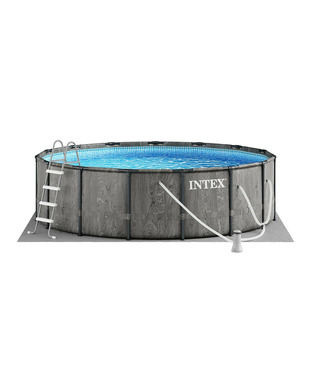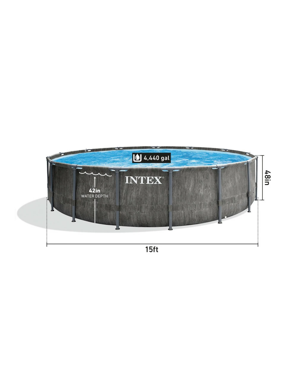 The new 15ft x 48in Intex® Greywood Prism Frame™ Premium Pool features a sophisticated woodgrain pattern that gives it a beautiful look and feel that will complement any backyard. The sturdy frames and the innovative new Polymer T-joints ensure durability and quick and easy assembly. It is constructed with puncture-resistant 3-ply durable material. Hydro Aeration® Technology is incorporated into the cartridge filter pump providing improved circulation and filtration, improved water clarity, and increased negative ions at the water surface. It comes with a 1,000 gal cartridge filter pump, ladder. Water capacity is 4,440 gallons (90%) and it is ready for water in 45 minutes.