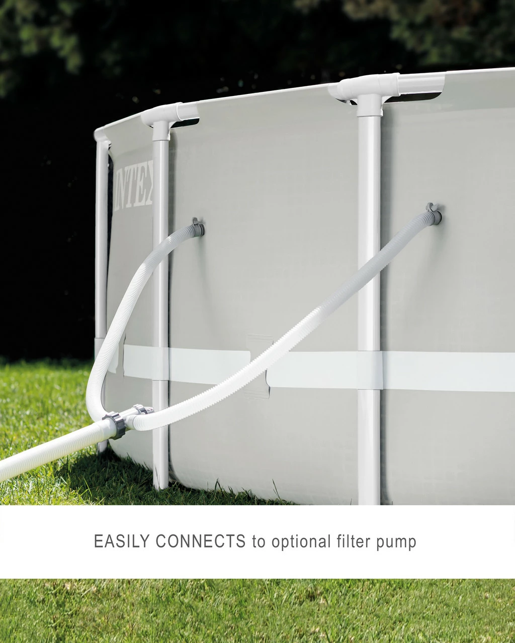 Enjoy hours of outdoor fun with the Intex® Prism Frame™ 10ft x 30in pool. It is constructed with puncture-resistant 3-ply durable material. It features all of the great benefits of Metal Frame pools, and are enhanced with strong powder-coated steel tubing and stylish and upscale looking liner color. Follow these 3 steps for easy assembly. 1) Lay out the liner for your pool on flat, level ground. 2) Assemble the frame for your pool. 3) Fill your pool with water and enjoy. Water capacity is 1,185 gallons (90%) and it is ready for water in 30 minutes.