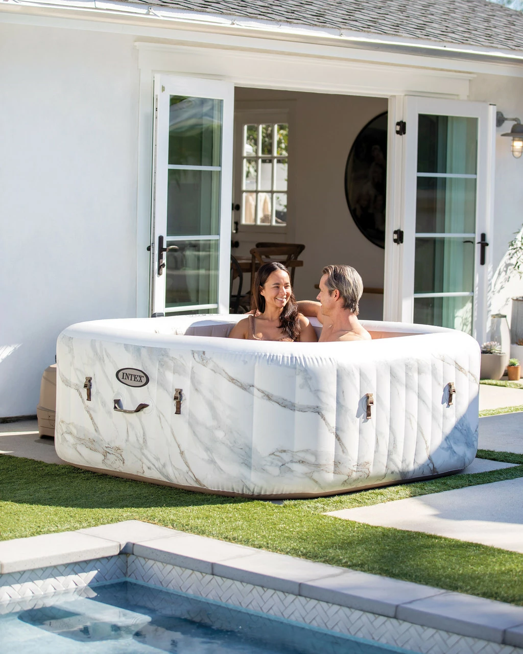 Multiply relaxation with the PureSpa™ Calacatta Dual Zone Deluxe by INTEX®. Step inside the stunning marble pattern, for an instant luxurious feeling. Choose between powerful dual jets positioned in 2 corners, wall surrounding heated bubbles, or both for pure indulgence. Easily adjust the heating system to your desired temperature. The combination of the state-of-the-art hard water treatment system and the advanced saltwater sanitation system creates a premium spa experience. Schedule your spa functions anytime and anywhere with The INTEX Link Spa Management App. The spa comes with a convenient energy efficient spa cover, up to 50% more energy efficient resulting in cost savings. PureSpa™ provides simple maintenance with easy-to-replace filter cartridges for lasting enjoyment for up to 4 people.