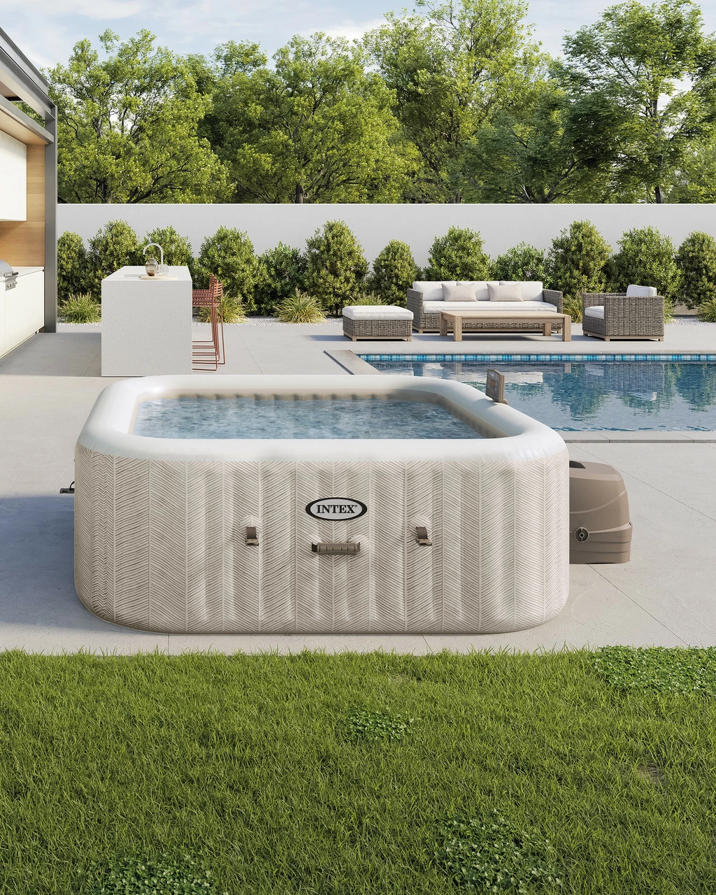 Relaxation with the PureSpa™ Chevron Deluxe by INTEX® can be started in just minutes. Step inside the elegant chevron patterned spa and activate the 170 soothing bubble jets for a refreshing massage. Designed with a convenient FastFill™ inflation system. Just simply inflate and deflate at a touch of a button, no external hose needed. The combination of the state-of-the-art hard water treatment system and the advanced saltwater sanitation system creates a premium spa experience. Easily schedule your spa functions anytime and anywhere with The INTEX Link Spa Management App. The spa comes with a convenient energy efficient spa cover, up to 50% more energy efficient resulting in cost savings. PureSpa™ provides simple maintenance with easy-to-replace filter cartridges for lasting enjoyment for up to 6 people.