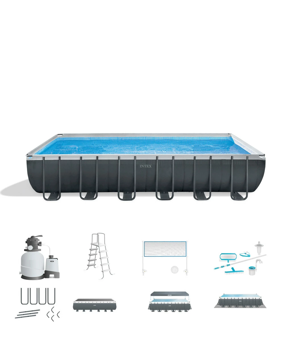 Maximize your pool experience with our largest Ultra XTR™ Frame pool. Classic rectangular shape, elegant graphite liner with water-blue tile print interior and brilliant white copings will make a fashion statement anywhere. Have an amazing time with family and friends with the spacious pool. This top-of-the-line above ground pool combines high-quality with style offering ease of ownership so that your pool time is truly fun time. It comes with a 2-year warranty on pool liner, frame and filter pump.