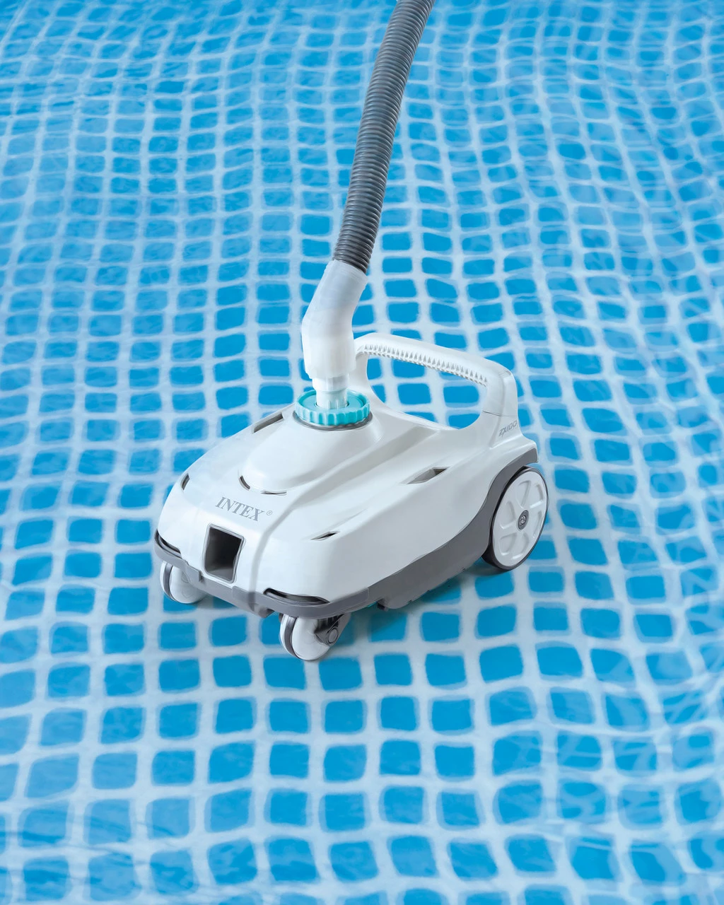 The INTEX® ZX100 is an ultra-convenient pressure-side automatic floor cleaner, convenient maintenance for spas and pools up to 18ft. Simply connect to the pool inlet fitting, and the suction is generated within the cleaner itself. Say goodbye to debris while it easily picks up leaves, dirt, sand, and bugs directly in a large capacity collection tray with a convenient carry handle. Engineered with oversized wheels that rotate in one direction to maintain an efficient cleaning path. Designed with a new angled hose elbow and swivel joint for no hose tangle and less hassle. Keep your pool clean all summer long.